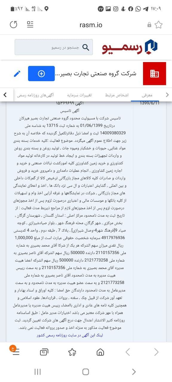 ادمین سلام مجدد، ی چن تا چیز میگم میرم. رفتم تحقیق در مورد اقای بصیری. اسم محمد بصیری رو سرچ میکنی واقعا شرکت دارن با اقوامشون اقا ناصر. یه شرکت جامه بصیری یکی هم بسته بندی.